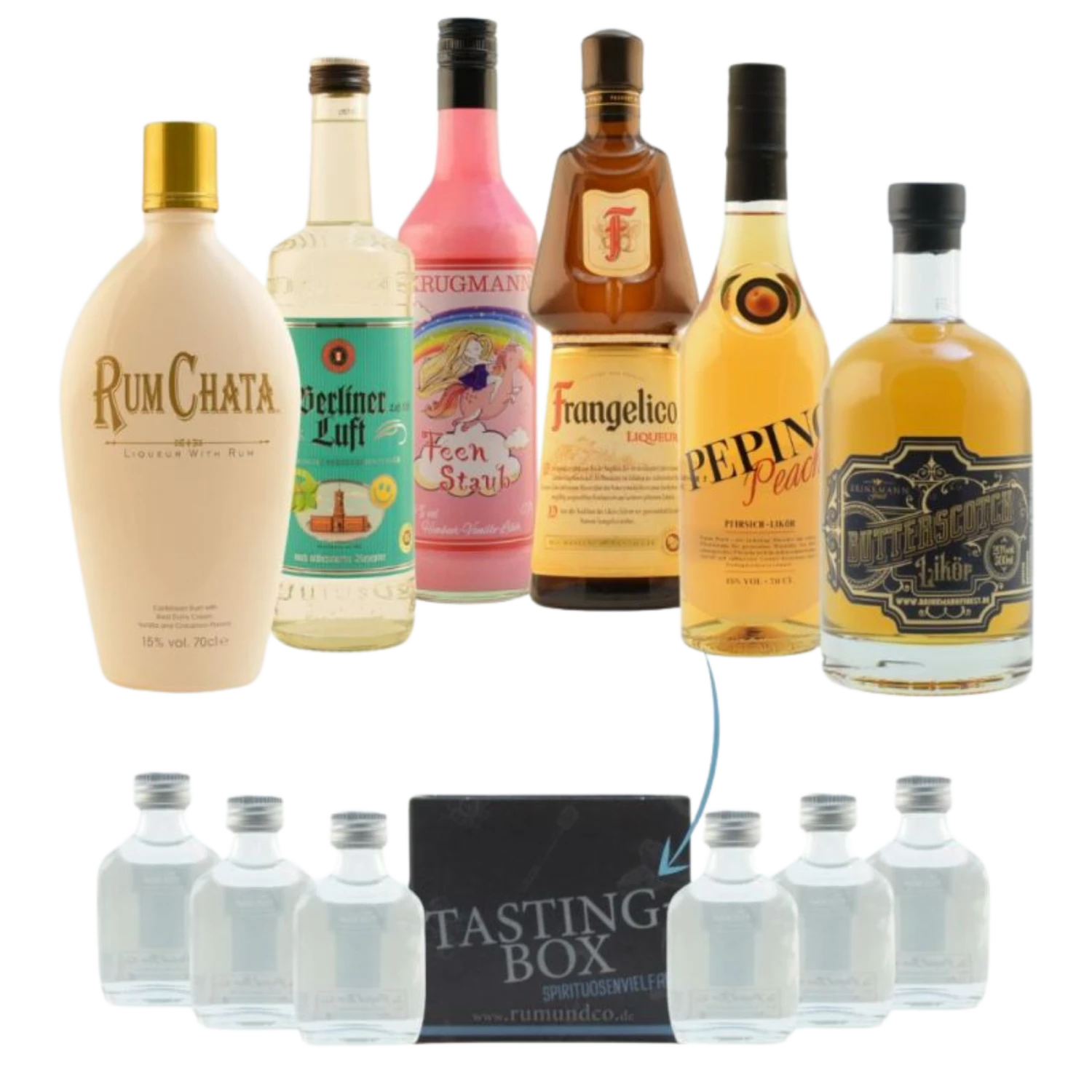 Was das Aroma und den Geschmack angeht, haben die Abfüllungen im Likör Tasting Set: Süßschnuten mehr zu bieten als ihre süße Hauptnote und ihre angenehm milde Trinkstärke. Wer Vanille mag, ist beim Feen Staub Himbeer Vanille Likör an der richtigen Stelle. Damit vergleichbar ist der Brinkmann Butterscotch Likör. Soll es lieber fruchtiger sein, eignet sich der Pepino Pfirsichlikör oder der RumChata Creamlikör. Feinherb und nussig kommt der kultige Frangelico Hazelnut Liqueur daher. Der Berliner Luft Pfefferminzlikör rundet das Ganze mit einer frischen Kräuternote ab.