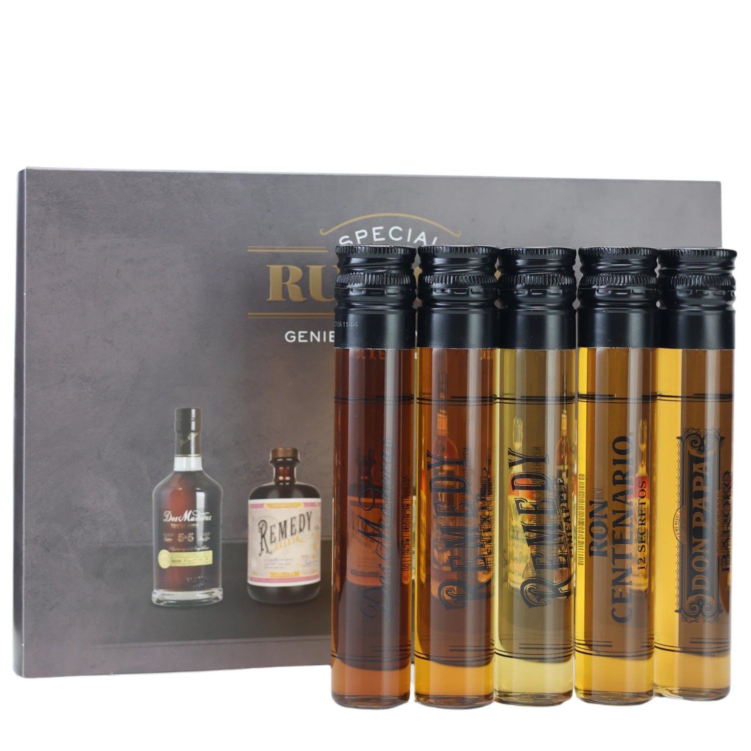 Was das Aroma und den Geschmack anbelangt, steht das Special Rum Tasting Set bis 40% für Vielfalt und Qualität. Der eine Rum gibt sich eher süßer, der andere eher trockener, der eine eher fruchtiger und der andere eher würziger. Neben mildem Rum aus der Dominikanischen Republik, Barbados, Guyana, Venezuela, den Philippinen, Trinidad und Costa Rica ist noch eine Spiced Spirituose auf Rum-Basis im 5-teiligen Special Rum Tasting Set bis 40% enthalten. Langweilig wird es also ganz bestimmt nicht. Bekannte und beliebte Marken wie Don Papa, Remedy, Dos Maderas und Centenario haben ihren weg in das Rum-Set für Anfänger gefunden.