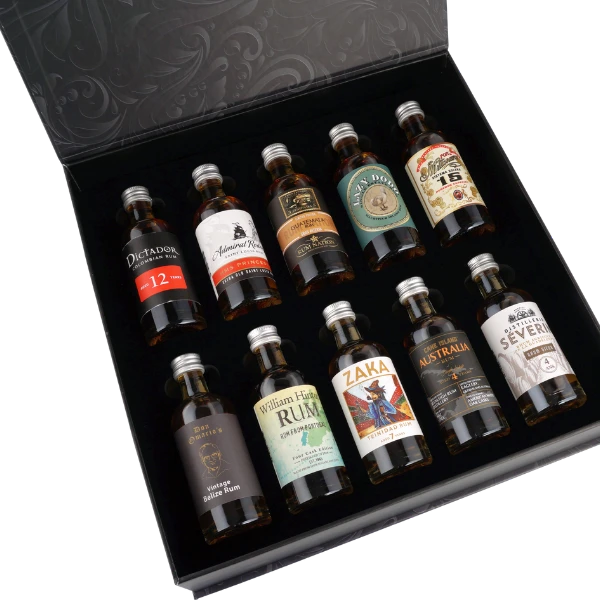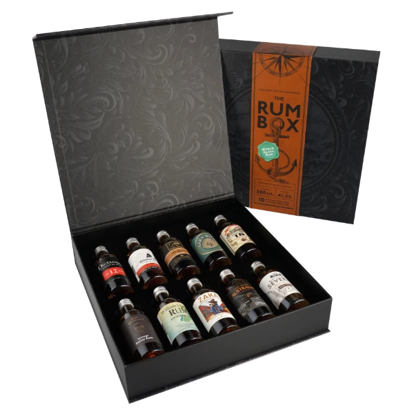Die praktische The Rum Box #1 wird ihrem Namen gerecht. Zehnmal Rum vom Feinsten wartet darauf, entdeckt zu werden. So manch einer wird sich so sehr in ein Produkt verlieben, dass er anschließend beim Rum kaufen die reguläre Flaschengröße wählt. Die kleinen Miniaturen mit jeweils 5 cl eignen sich wunderbar für ein selbst zu Hause veranstaltetes Rum-Tasting zum direkten Vergleich des Inhalts. Dabei begeistert die stylishe The Rum Box #1 dank ihrem ästhetischen Design auch das Auge. Was die Nase und den Gaumen angeht, so ermöglichen die Rumsorten einen Streifzug durch ein breitgefächertes Sortiment. Ein Grund mehr, warum sich das Rum-Set nicht zuletzt als Geschenkidee anbietet.